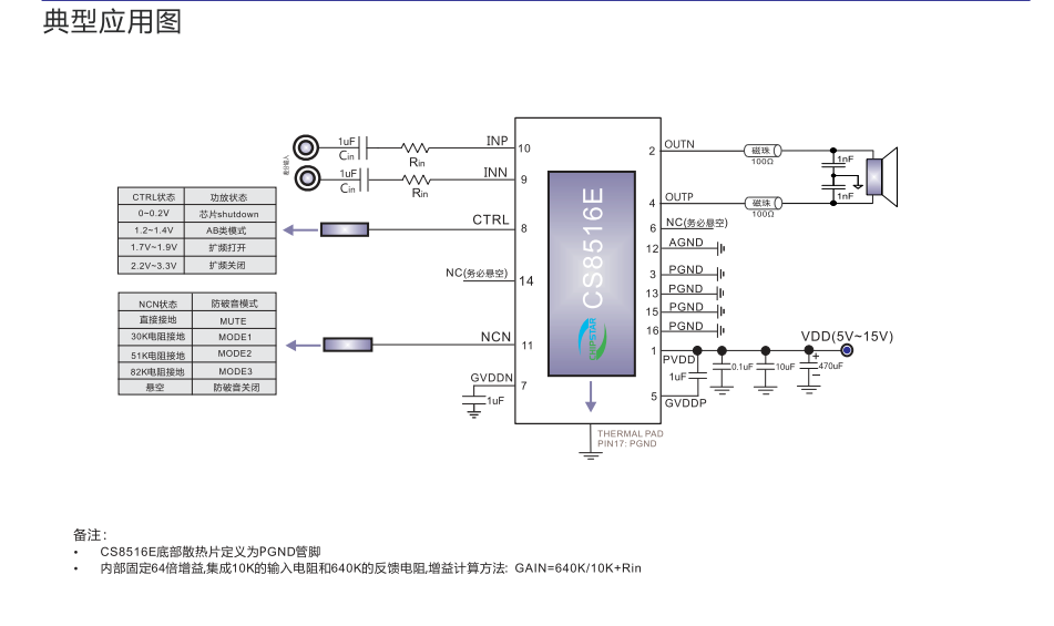 CS8516E的全差分架構(gòu)和極高的PSRR有效地提高對(duì)RF噪聲的抑制能力。無需濾波器的PWM調(diào)制結(jié)構(gòu)及內(nèi)置的BOOST升壓模塊,以及CS8516E采用專有的AERC((Adaptive Edge Rate Control)技術(shù),在音頻全帶寬范圍內(nèi)極大地降低了EMI的干擾, 對(duì)60cm的音頻線,在FCC的標(biāo)準(zhǔn)下具有超過20dB的裕量,另外CS8516E內(nèi)置了過流保護(hù),短路保護(hù)和過熱 保護(hù),有效的保護(hù)芯片在異常的工作條件下不被損壞