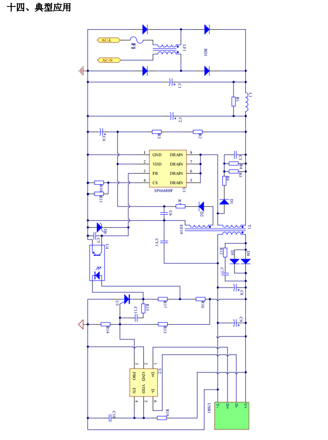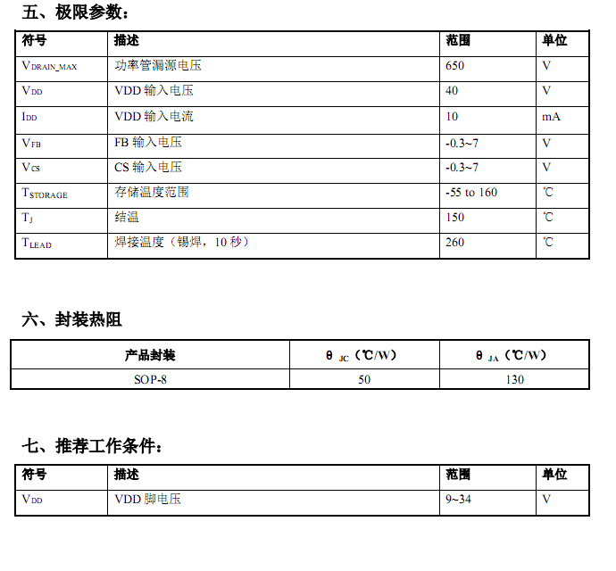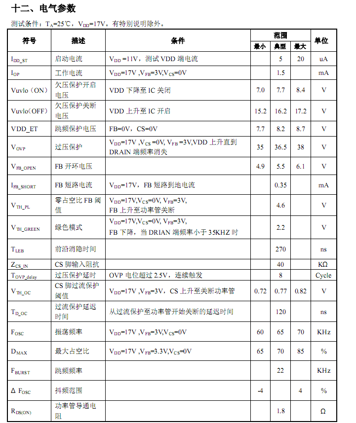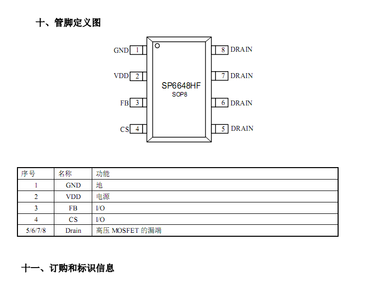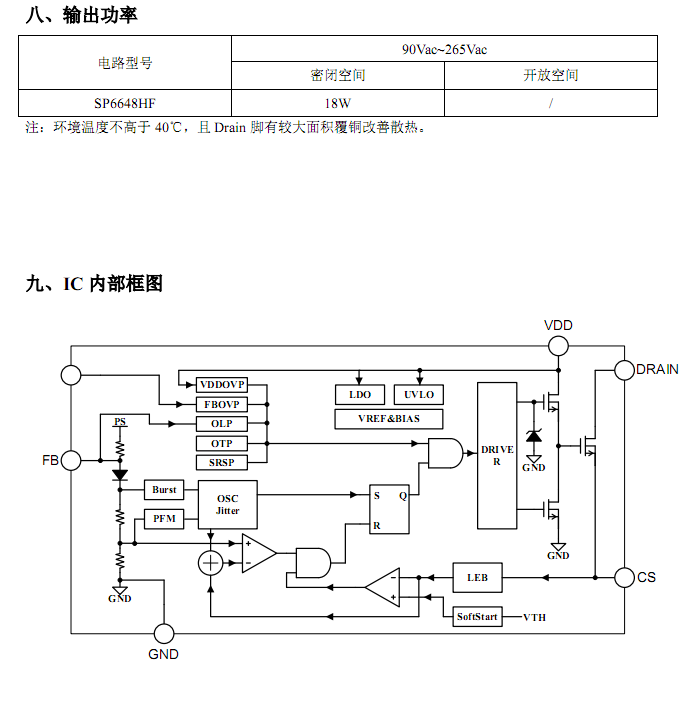 SP6648HF是一顆電流模式PWM控制芯片,內(nèi)置 650V高壓功率MOSFET,應(yīng)用于功率在18W以內(nèi)的方案。SP6648HF在 PWM模式下工作于固定開關(guān)頻率,這個(gè)頻率是由內(nèi)部精確設(shè)定。在空載或者輕載時(shí),工作頻率由IC 內(nèi)部調(diào)整。芯片可以工作在綠色模式,以此來減小輕載時(shí)的損耗,提高整機(jī)的工作效率。SP6648HF在啟動(dòng)和工作時(shí)只需要很小的電流,可以在啟動(dòng)電路中使用一個(gè)很大的電阻,以此來進(jìn)一步減小待機(jī)時(shí)的功耗。芯片內(nèi)置有斜坡補(bǔ)償電路,當(dāng)電路工作于大占空比時(shí),避免次諧波振蕩的發(fā)生,改善系統(tǒng)的穩(wěn)定性。內(nèi)置有前沿消隱時(shí)(Leading-edge blanking time),消除緩沖網(wǎng)絡(luò)中的二極管反向恢復(fù)電流對(duì)電路的影響。SP6648HF采用了抖頻技術(shù),能夠有效改善系統(tǒng)的 EMI性能。系統(tǒng)的跳頻頻率設(shè)置在音頻(22KHz)以上,在工作時(shí)可以避免系統(tǒng)產(chǎn)生噪音。SP6648HF內(nèi)置多種保護(hù),包括逐周期限流保護(hù)(OCP),過載保護(hù)(OLP),過壓保護(hù)(VDD OVP), VDD 過壓箝位,欠壓保護(hù)(UVLO),過溫保護(hù)(OTP)等,通過內(nèi)部的圖騰柱驅(qū)動(dòng)結(jié)構(gòu)可以更好的改善系統(tǒng)的EMI特性和開關(guān)的軟啟動(dòng)控制。